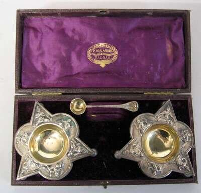 Retailed by P. Orr & Sons, Madras, each with a silver-gilt basin surrounded by various Buddhas, in a fitted case with one salt spoon in the form of a Cobra. (3).