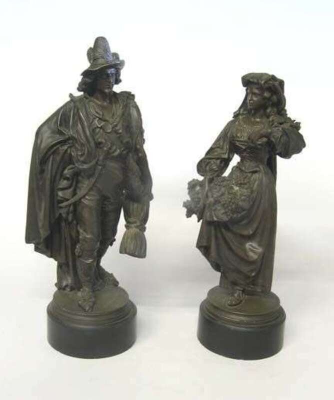 Modeled as a farmer and his wife, each signed A. Halou, raised on circular marble bases.