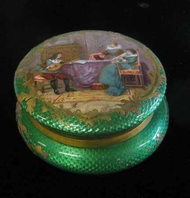Of circular bombe form, the hinged lid painted with an interior scene, against a green guilloche enamel ground enriched with gilt.