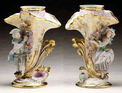 Of flared form, the sides molded with bisque figures, depicting a dandy and his companion, on white gilt enhanced ground.