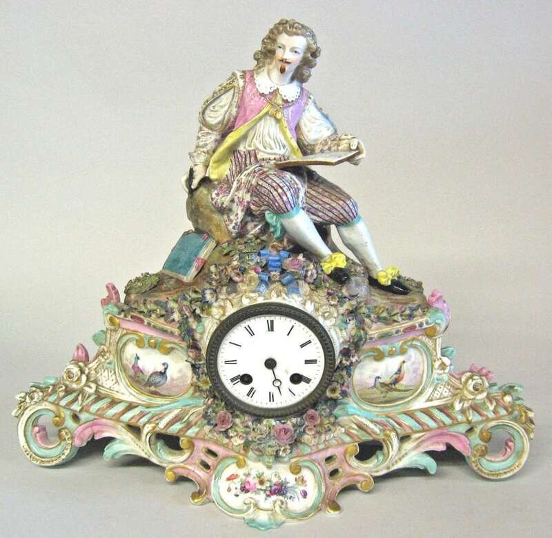 Surmounted by a figure of an artist in 18th century attire, his sketch pad on his knee, over a floral encrusted clock base with painted reserves of birds and flowers.