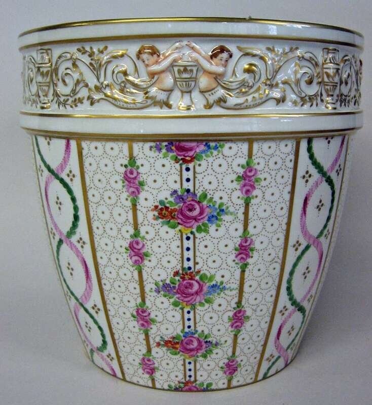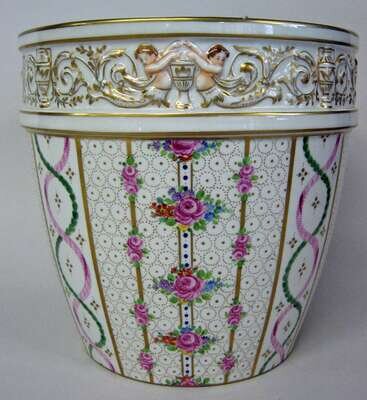 The rim decorated with rinceau banding above foliate sprays and gilt details, blue printed mark.