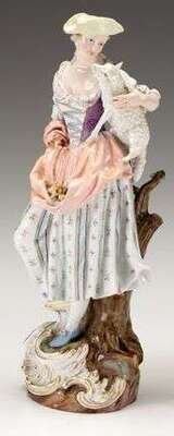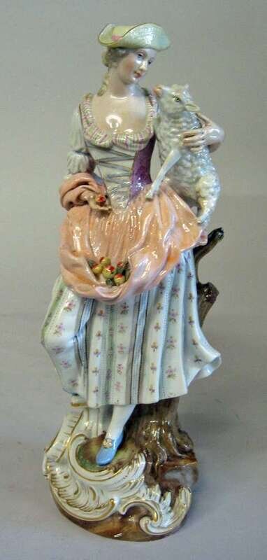 Modeled as a shepherdess holding a lamb on her hip, underglaze blue crossed swords mark, incised and impressed marks.