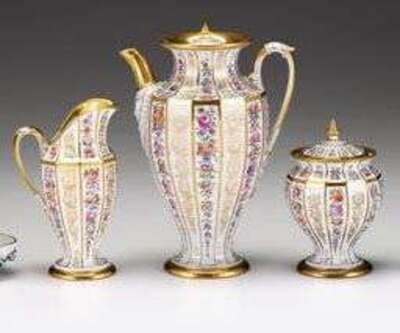 Of classical form, the segmented bodies decorated with alternating panels of floral garlands and scrolls against a white ground with gilt enhancements, the coffeepot with a female mask spout. (3).