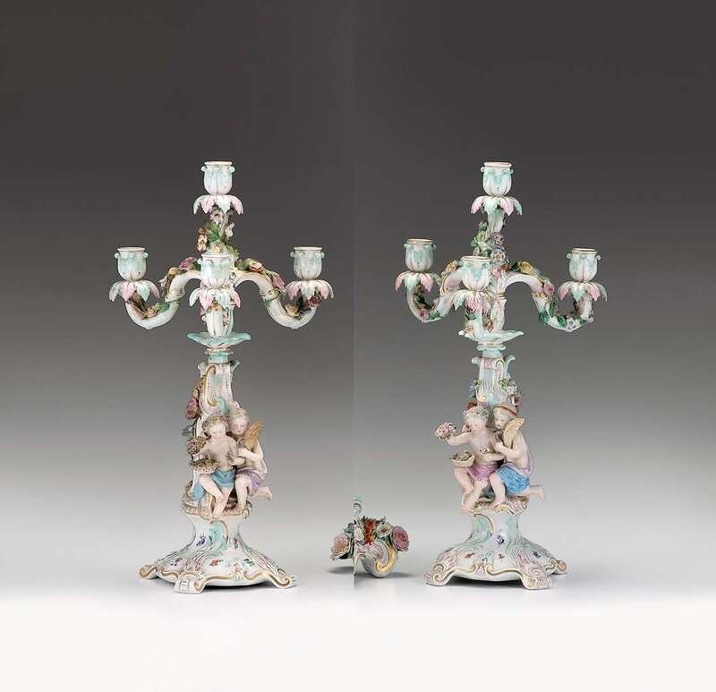 Each having one central and three scrolling candle arms, encrusted with flowers and with acanthus drip pans, the stem mounted with figures emblematic of Spring and Summer, on a squared base with outscrolling corners, blue underglaze crossed swords mark, incised E128. (2).
