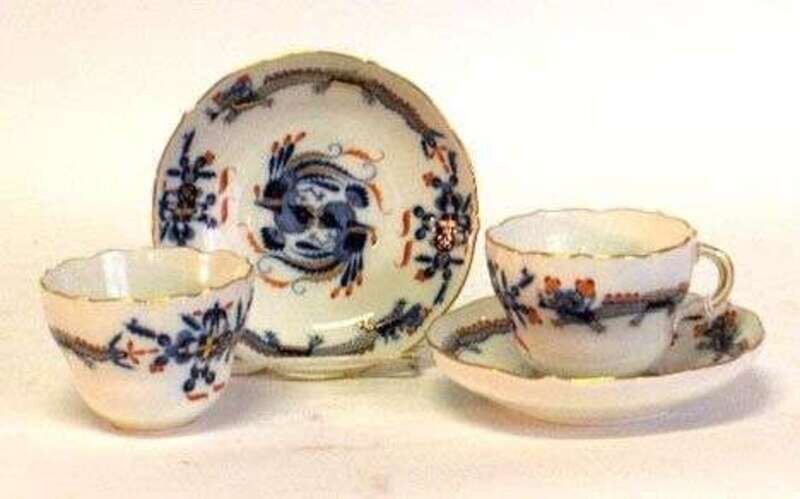 Decorated in the Imari palette with dragons, exotic birds and stylized plant forms, enhanced with gilt, blue crossed swords mark.