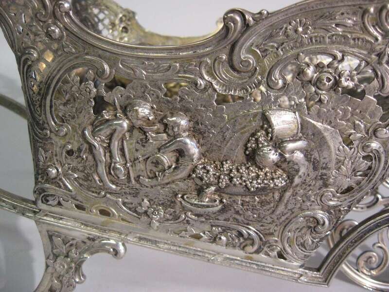 Decorated with repousse and reticulated panels depicting putti making wine and aiming arrows at nesting storks.