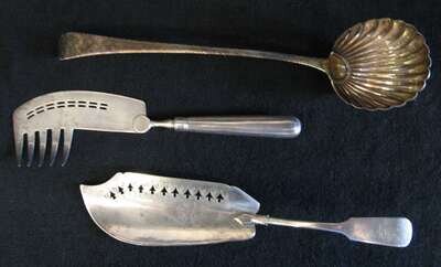 Comprising a ladle with a shell form bowl, mark for Thomas Chawner, 1771; a fish slice, maker's mark IG, 1806; and a hollow handle server, mark for William Eley & William Fearn, 1816. (3).