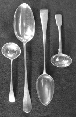 Comprising a stuffing spoon, Thos. & Geo. Hayter, London, 1823; a larger stuffing spoon, marks rubbed; a sauce ladle, George Purse, London 1821; and another sauce ladle, John Wren, London 1789. (4).