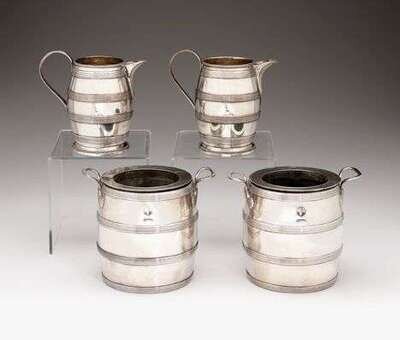Each of barrell form, together with a pair of similar water pitchers. (4).