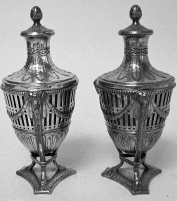 Each with a leaf-cast lid with berried finial above a reticulated body marked with ram's masks and hung with garlands, raised on a trefoil supports ending in hoof feet, with cobalt glass liners.
