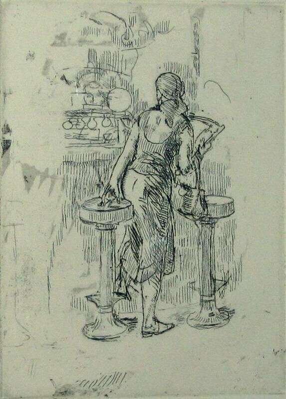 TWO PRINTSISABEL BISHOP (AMERICAN 1902-1988) "GIRL GETTING ON SODA FOUNTAIN STOOL"
