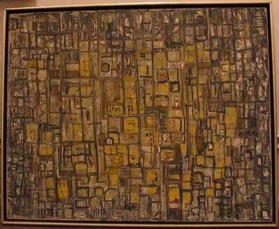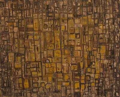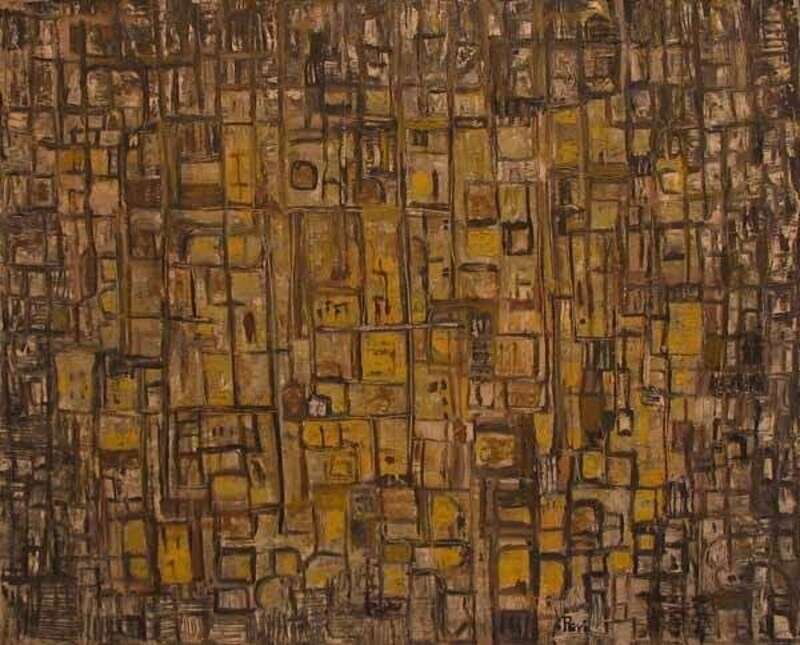 *PEYI (AMERICAN SCHOOL 20TH CENTURY) COMPOSITION ABSTRACT IN GREY WHITE AND YELLOW