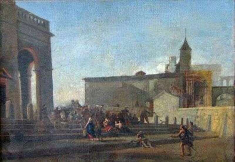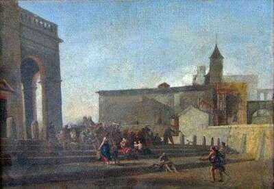 FOLLOWER OF PAOLO ANESI (ITALIAN CIRCA 1700-1761) FIGURES ON THE STEPS OF THE PIAZZA