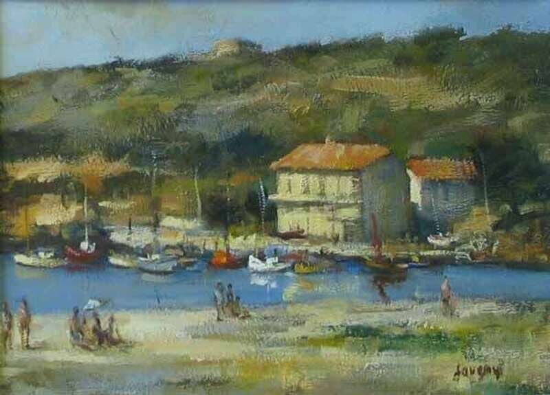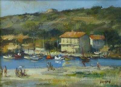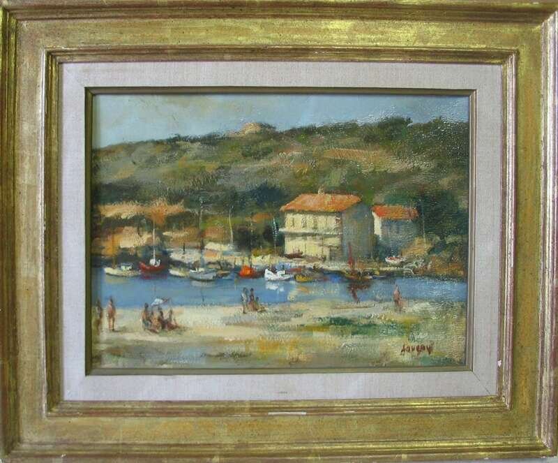 DANIEL JANGUEY (FRENCH B. 1929) BAY BEACH SCENE WITH SAILBOATS