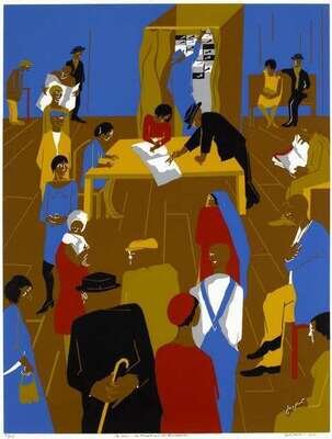 JACOB LAWRENCE (AMERICAN 1917-2000) "THE 1920'S...THE MIGRANTS ARRIVE AND CAST THEIR BALLOTS"