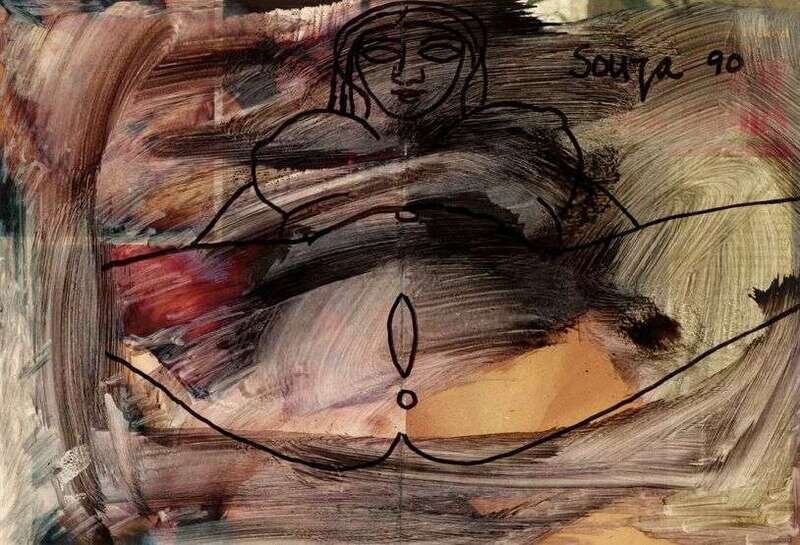 Signed and dated "Souza 90" upper right, chemical alteration on magazine paper