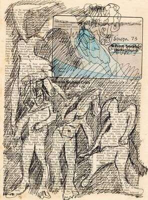 Signed and dated "Souza 73" upper right, ink and mixed media on magazine paper