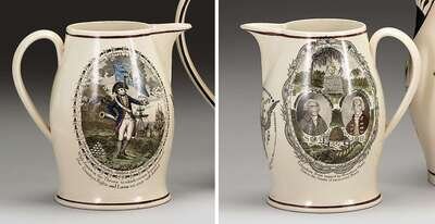 Transfer-printed and polychromed creamware commemorative Pitcher early 19th century