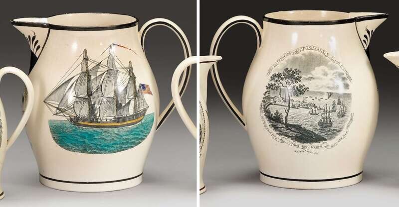 Decorated on one side with "Defense of Stonington" (McCauley No. 129), and with a three-masted ship flying two American flags reverse, and with eagle and shield above bannerette inscribed "E Pluribus Unum" and initials "MC" below spout.