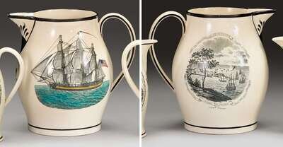 Liverpool creamware black transfer and polychrome decorated commemorative pitcher early 19th century