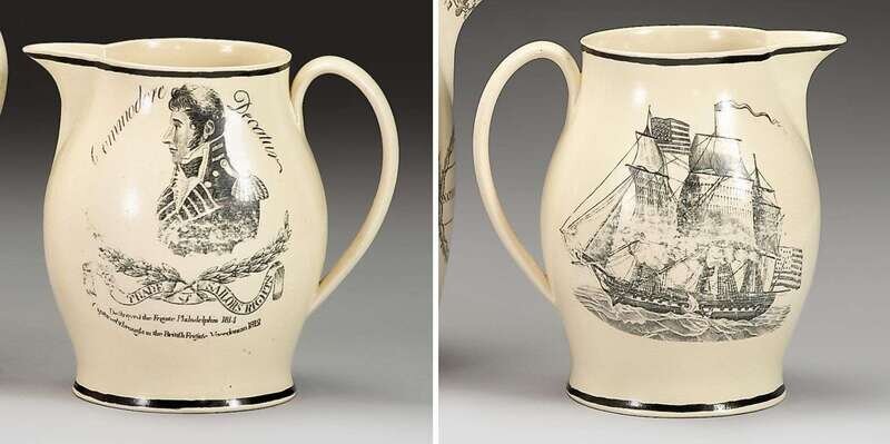 Of baluster form decorated with inscriptions "Commodore Decatur," and "Destroyed the Frigate Philadelphia 1814 Captured and Brought in the British Frigate Macedonia 1812," enclosing a portrait bust of Stephen Decatur and crossed fronds and bannerette with inscription "Free Trade and Sailors Rights" (McCauley No. 14); the reverse with a three-masted ship flying two American flags and a pennant.