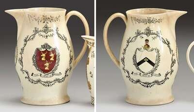 Liverpool creamware black transfer-printed and polychrome decorated marriage pitcher early 19th century