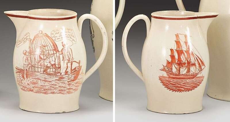 Decorated with a cartoon showing a caged Napoleon in a boat with captions "A present from Waterloo by Marshalls Wellington & Blucher," and "My Dear Megg of Wapping We shall soon have him on Shore and shiver my timbers if ever We Let him loose again," the reverse decorated with a three-masted ship flying the American flag.