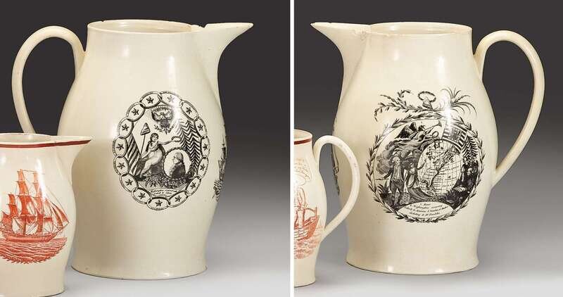 Decorated on one side with "Washington Crowned by Liberty" (McCauley No. 53), and marked "F. Morris Shelton," the other side with "Washington Map" (McCauley No. 58B), and marked "F. Morris Shelton," and with three-masted ship below spout.