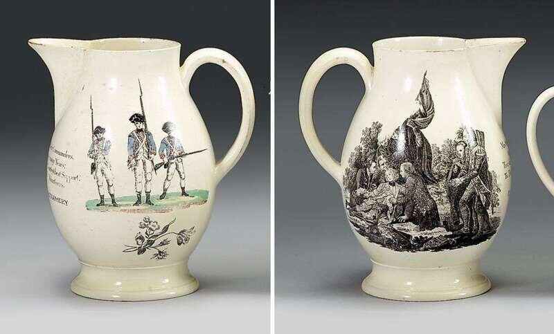 Decorated on one side with"Death of Wolfe" (McCauley No. 100), and with verse, "May they and their Commanders, live happy many Years; Their King their Country's best support, The Dundonald Volunteers," and "John Montgomery" below spout, the reverse with three "Volunteers" in polychrome with fixed bayonets, above a floral sprig.