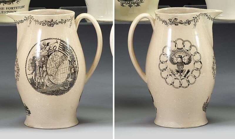 Of elongated ovoid form, decorated with floral swag above "E Pluribus Unum" or great American Seal, with ring of sixteen states, "Washington-Map of the United States (McCauley No. 58) and floral reserve enclosing "Woodward Abraham Senr" above figure of Hope under spout.