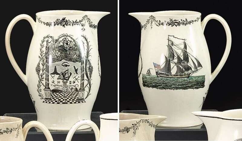 Decorated on one side with "Masonic Arms," a two-masted ship in polychrome reverse, the initials "RE" and eagle below spout.