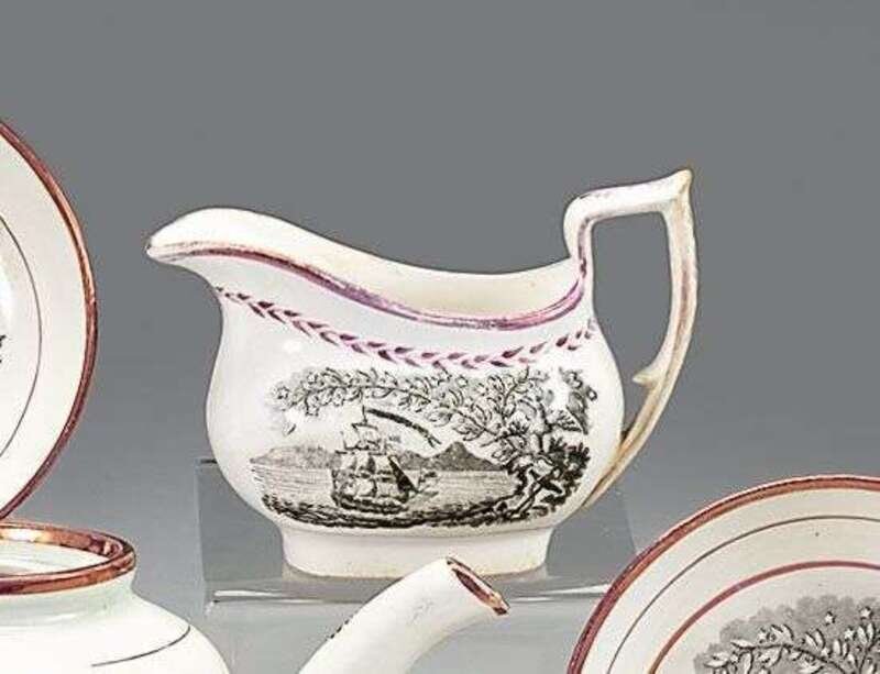 Oval form decorated with Fulton steamer on one side and Cadmus with eagle on a rock on the other side, pink lustre vine border and banding.