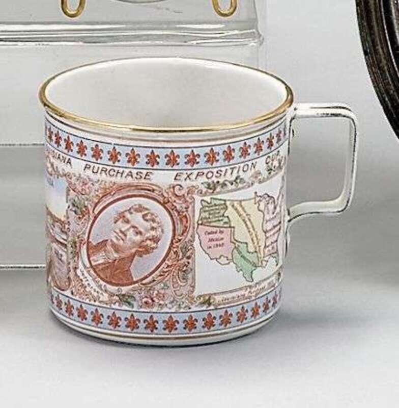 The World's Fair St. Louis 1904, Louisiana Purchase Exposition Cup of cylindrical form with portraits of Napoleon and Jefferson, maps of the United States in 1803 and 1903 and view of the Exposition.