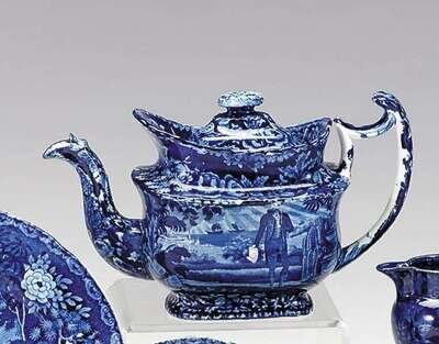 Historical blue transferware teapot enoch wood and son, burslem, 1819-1846