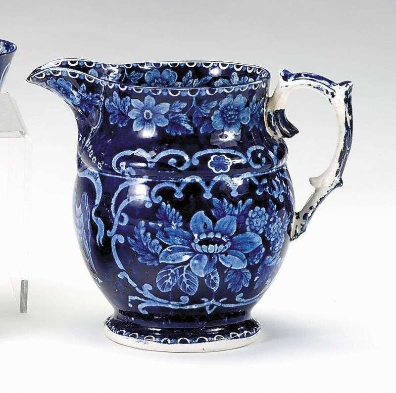 Historical blue transferware pitcher w. adams and sons, tunstall, circa 1834