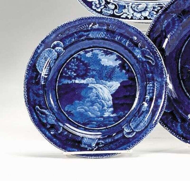 Decorated with "View of Trenton Falls" (Larsen No. 37) within a shell border with circular center.