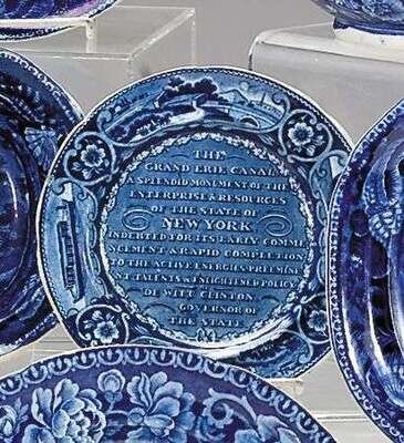 Decorated with "Erie Canal Inscription, De Witt Clinton Eulogy" (Larsen No. 638), within a canal boat medallion border.