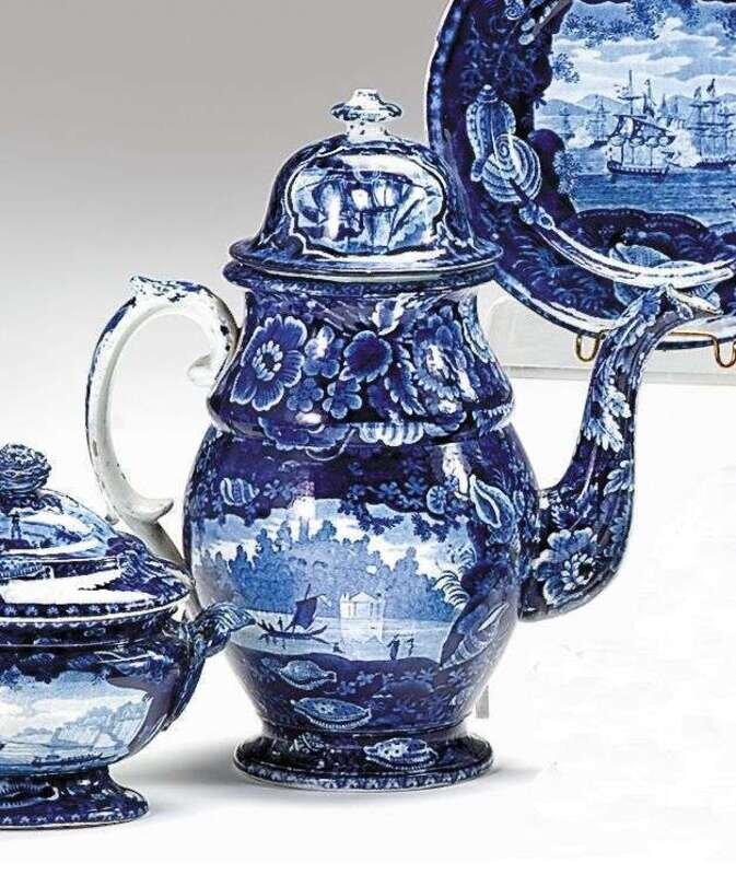 Historical blue transferware coffeepot enoch wood and sons, burslem, 1819-1846