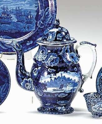 Historical blue transferware coffee pot enoch wood and sons, burslem, 1819-1846