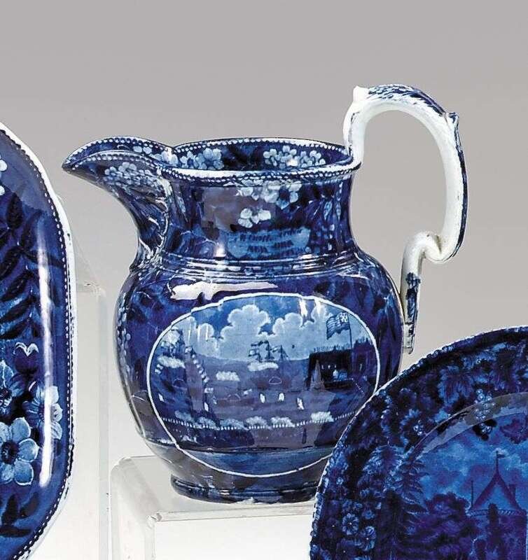 Historical blue transferware pitcher james and ralph clews, cobridge, 1829-1836