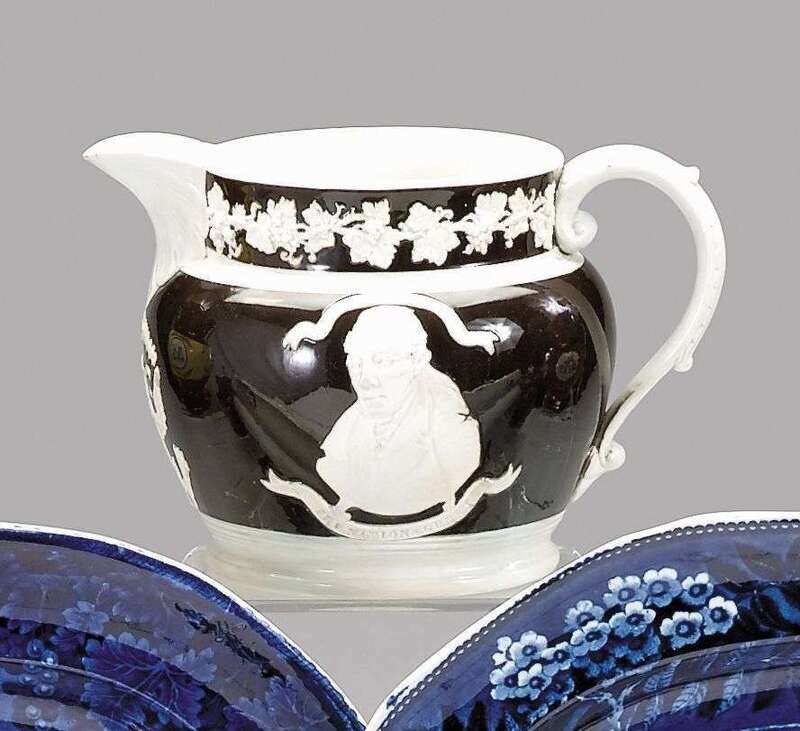 Brown Jasperware commemorative pitcher circa 1820-1830