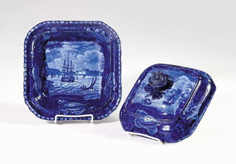 Of square form, the cover with floral knop, decorated with "Ship of the Line in the Downs," within a shell border.