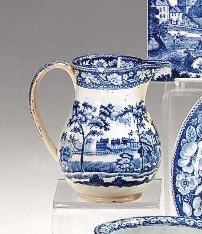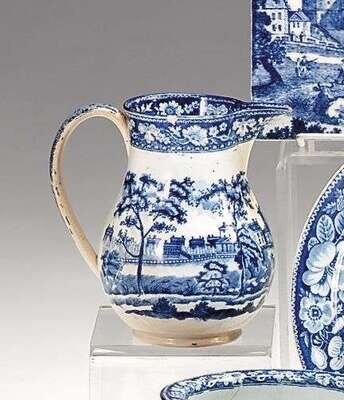 Historical blue transferware small pitcher john rogers and son, longport, 1815-1842