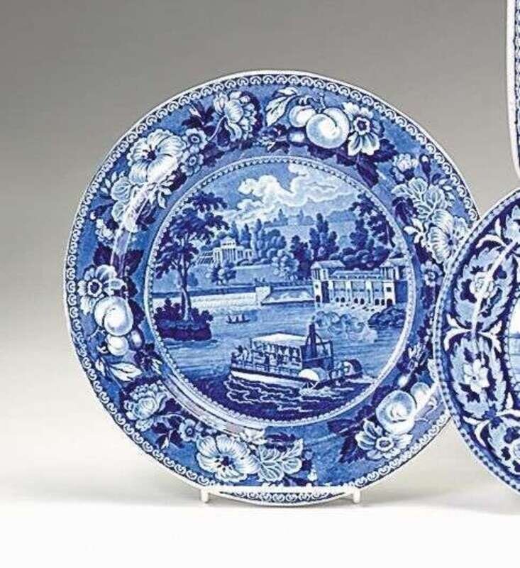 Decorated with "The Dam and Water Works, Philadelphia" (Larsen No. 535), within a fruit and flower border.