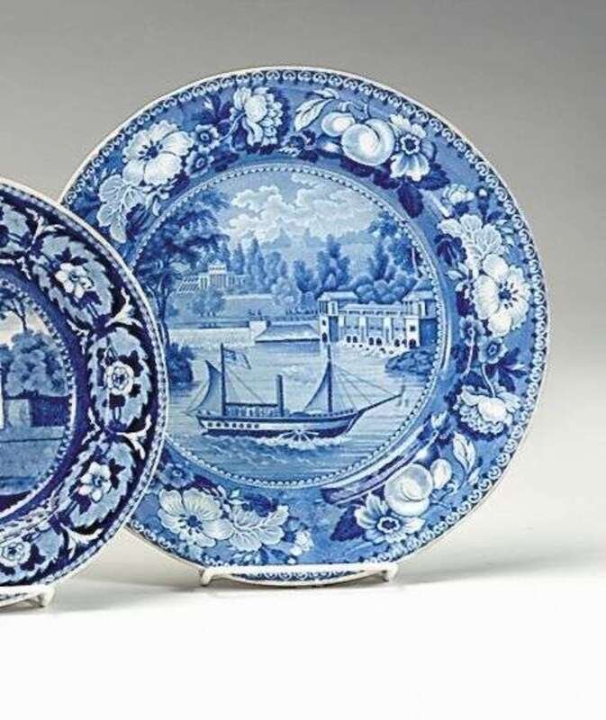 Decorated with "The Dam and Water Works, Philadelphia" (Larsen No. 536) within a fruit and flower border.