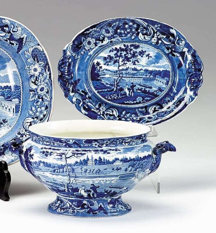 Historical blue transferware soup tureen and stand joseph stubbs, burslem, early 19th century