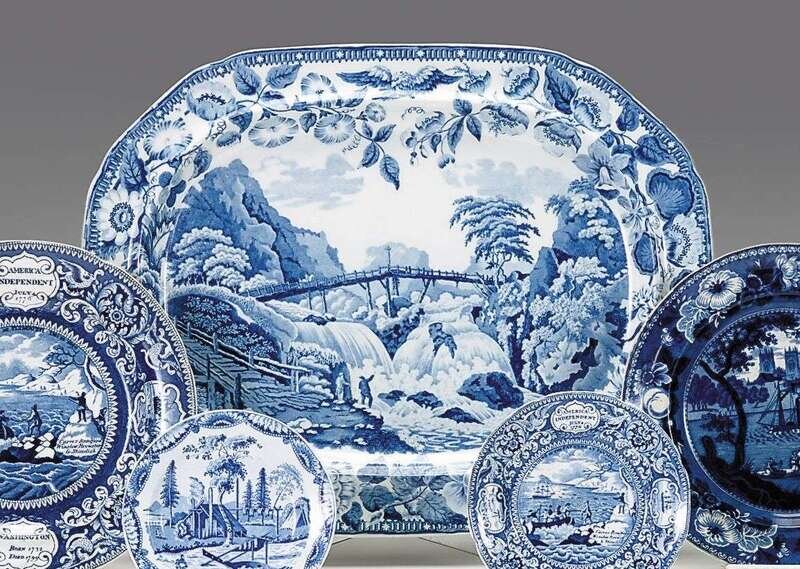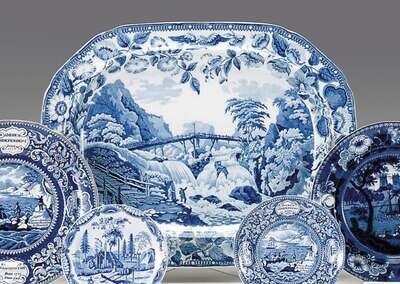 Oblong form decorated with an unrecorded view of the "Headwaters of the Juniata River in Ohio" within wide floral border with Eagle at center top and star outer border.