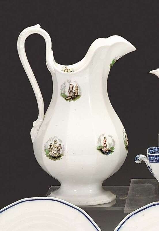 Historical transferware and enameled pitcher mellor, venerables & co, burslem, 1834-1851