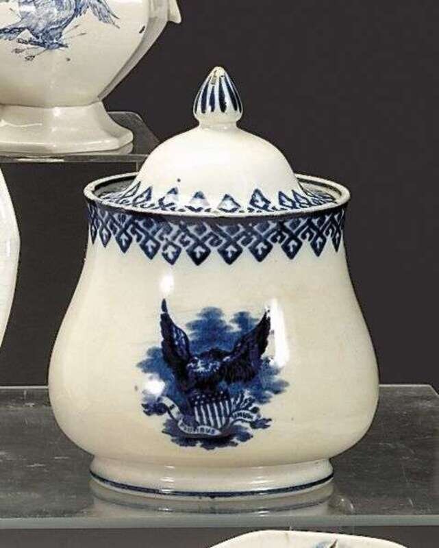 Domed lid on bulbous body decorated with eagle with outstretched wings and American shield above bannerette inscribed "E. Pluribus Unum" under fretwork border, "Gem" pattern.
